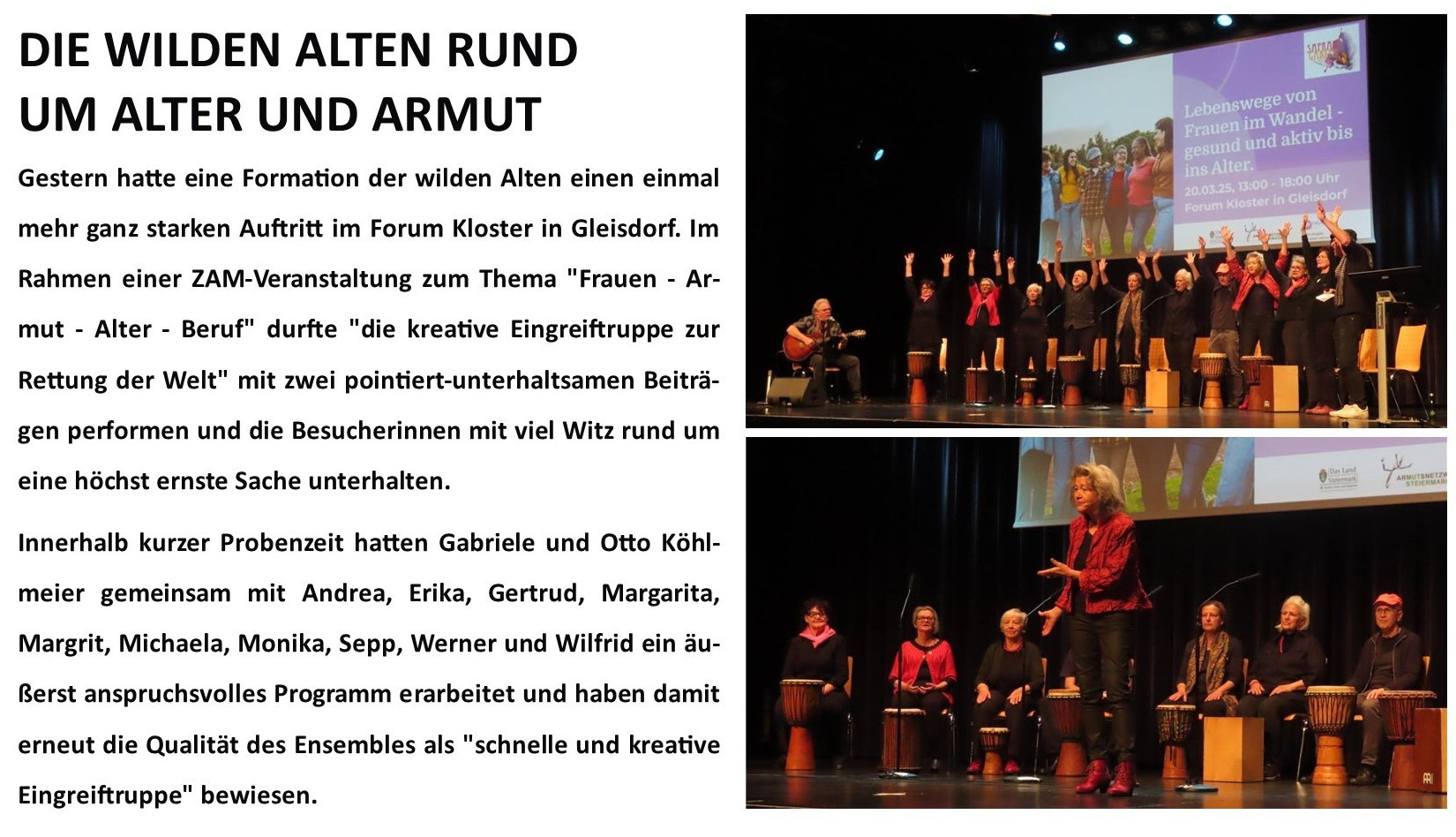 Das „ZAM“, das steirische Zentrum für Ausbildungs-Management, dessen Ziel die Verbesserung der Chancen von Frauen am Arbeitsmarkt durch Qualifizierung ist, hat die wilden Alten eingeladen, bei einer Tagung im Forum Kloster Gleisdorf zum Thema „Frauen—Alter—Armut“ ein Programm in zwei Teilen zu präsentieren. Ein Programm, welches das bestehende „Altersprogramm“ mit dem Moment „Frau“ verbindet. Gerade im „Frauenmonat März“ war es den wilden Alten geradezu ein Anliegen, darauf hinzuweisen, dass Frauen in unserer männerdominierten Gesellschaft noch immer stark benachteiligt sind. Und dass sie vor allem im Alter vermehrt unter Armut zu leiden haben. Die wilden Alten schafften die Herausforderung mit Bravour. Die Besucherinnen unterhielten sich zwei mal zwanzig Minuten hindurch bestens.