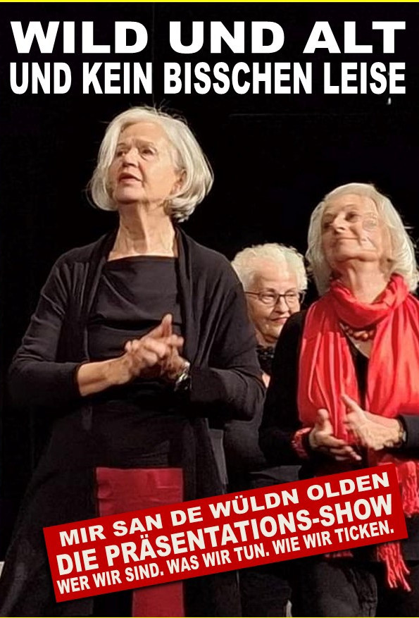 In ihrem ersten Programm haben sich die wilden Alten konsequenterweise mit dem Thema „Alter und Altsein“ auseinandergesetzt. Nach intensivem Austausch, zahlreichen Diskussionen und viel Spaß bei der gegenseitigen Erklärung der Freuden wie Leiden im letzten Lebensabschnitt, wurde mit den gemachten Erfahrungen und den gesammelten Materialien ein Bühnenprogramm erarbeitet. Ein Programm, das in unterhaltsamer Form einerseits das Thema vermitteln, das andererseits aber auch die Ziele der wilden Alten transportieren sollte, nämlich: dass Alter kein Grund ist, sich aufzugeben und zu verblöden, sondern dass ältere Menschen Qualitäten besitzen, die es zu nutzen gilt. Unter dem Motto „mir san de wüldn Olden, wolln net de Goschn holten“ wurde ein Mix aus Szenen und Liedern, aus Theater und Kabarett geschaffen, die in witzig-pointierter Form klar macht, das Ruhestand noch lange nicht Stillstand heißt. Diese „Präsentations-Show“ ist auch so etwas wie die