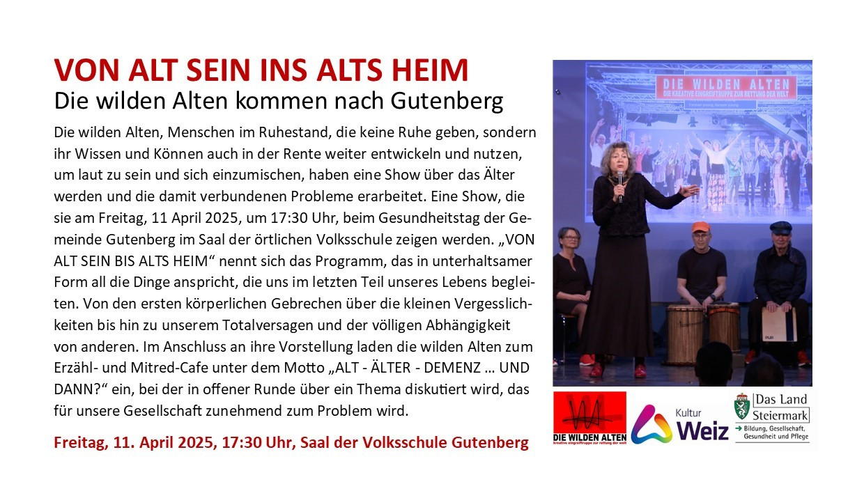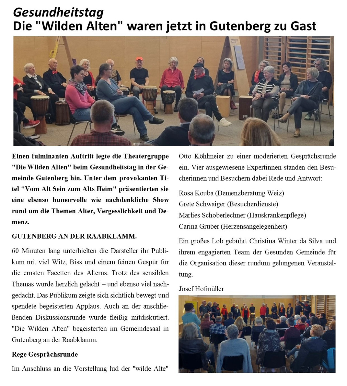 Ein Beispiel dafür, wie themenorientiert das Präsentationsprogramm „Wir sind die wilden Alten“ erweitert und eingesetzt werden kann, wurde in der Gemeinde Gutenberg bewiesen. Dort stand ein Gesundheitstag auf dem Programm und die wilden Alten wurden gebeten, im Rahmen dieser Veranstaltung ihr Programm zu zeigen. Und dieses vielleicht etwas dem Schwerpunktthema „Demenz und Alzheimer“ anzupassen. Also wurden einige Szenen verändert, erweitert, ergänzt und eine Sache geboten, die beim Publikum bestens ankam. Und zusätzlich moderierten die wilden Alten dann auch noch die Diskussion hinterher, bei der sie aus ihrer reichhaltigen Erfahrung rund um Alter und Krankheit berichten konnten.