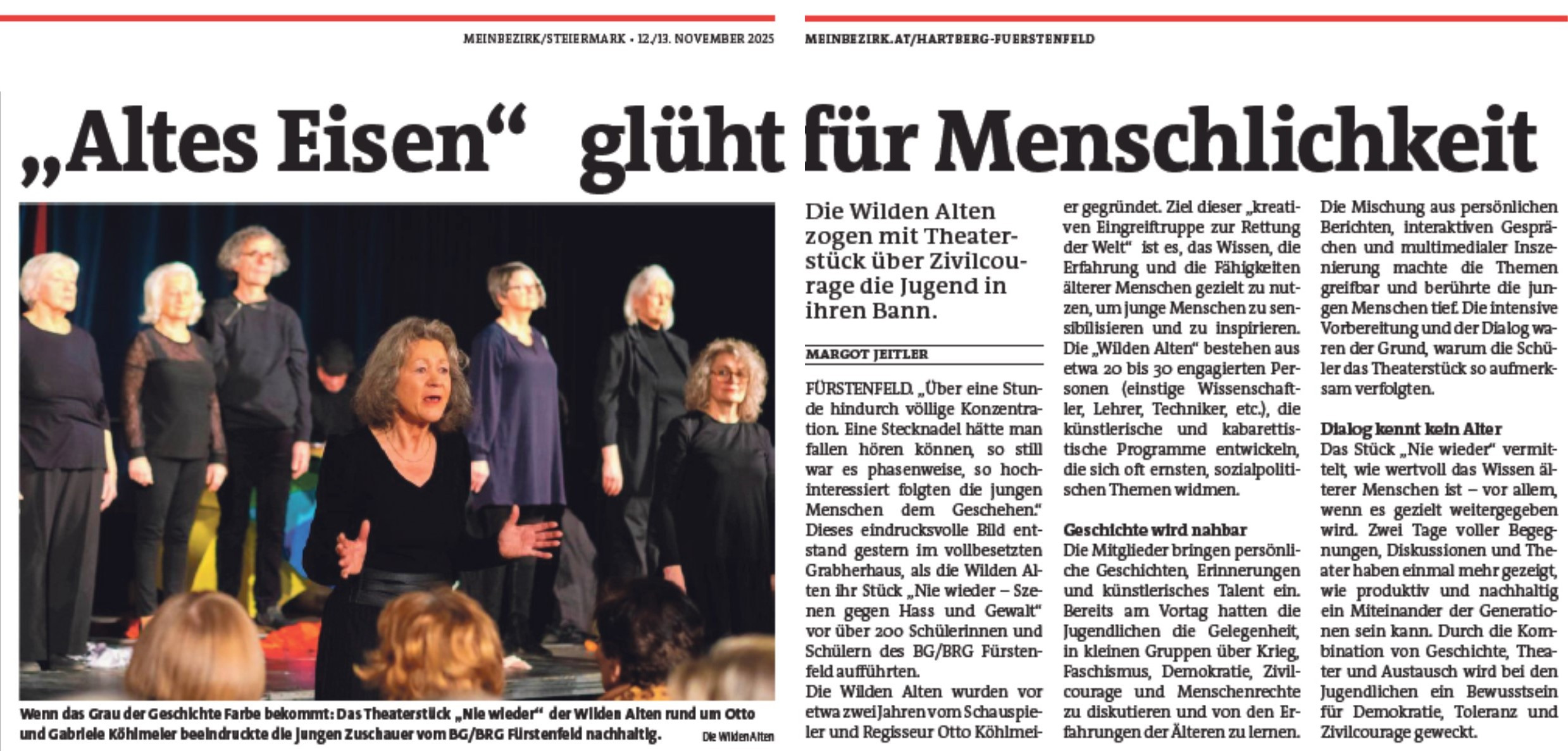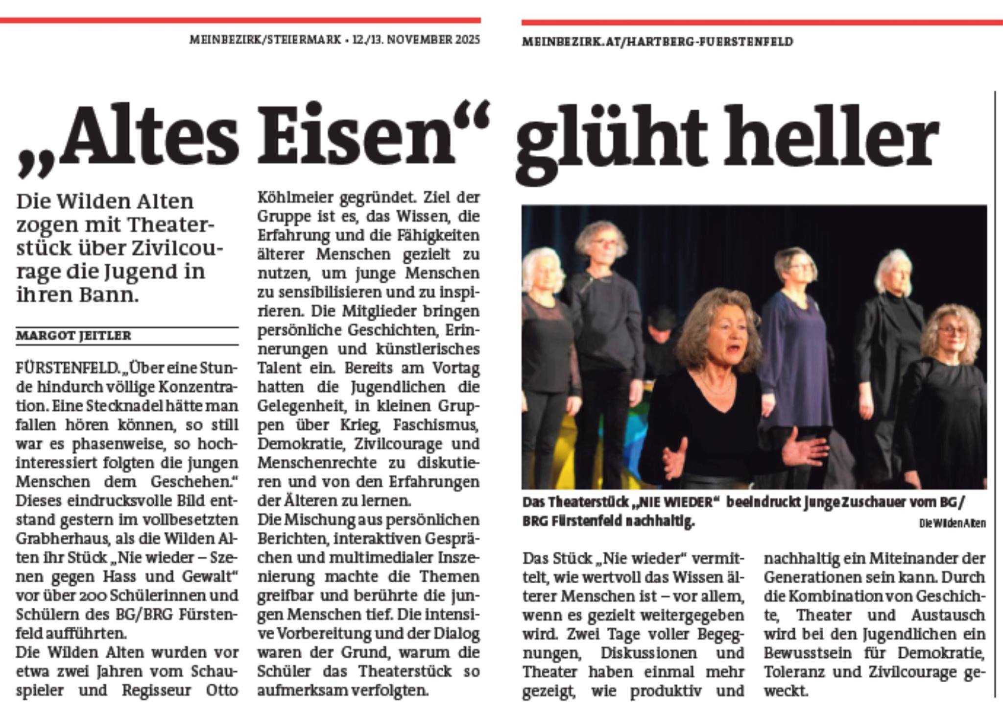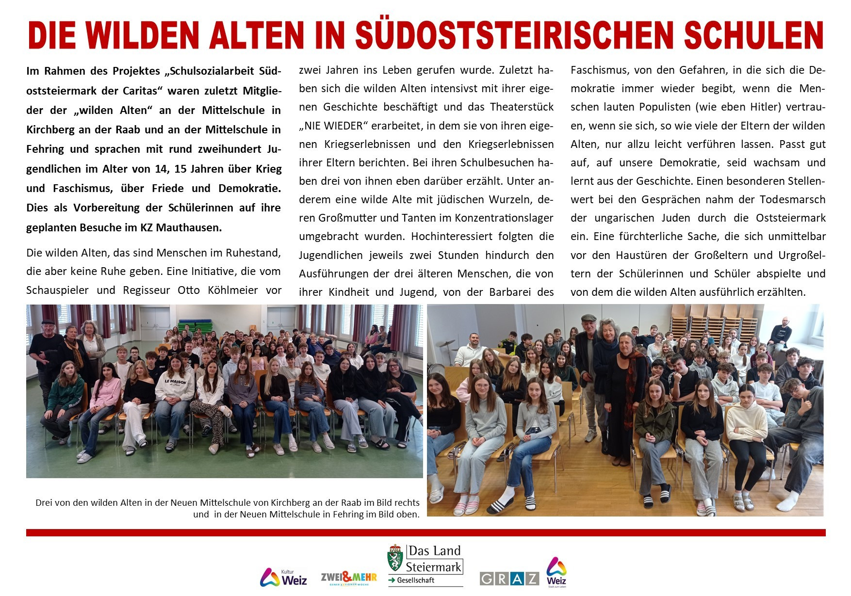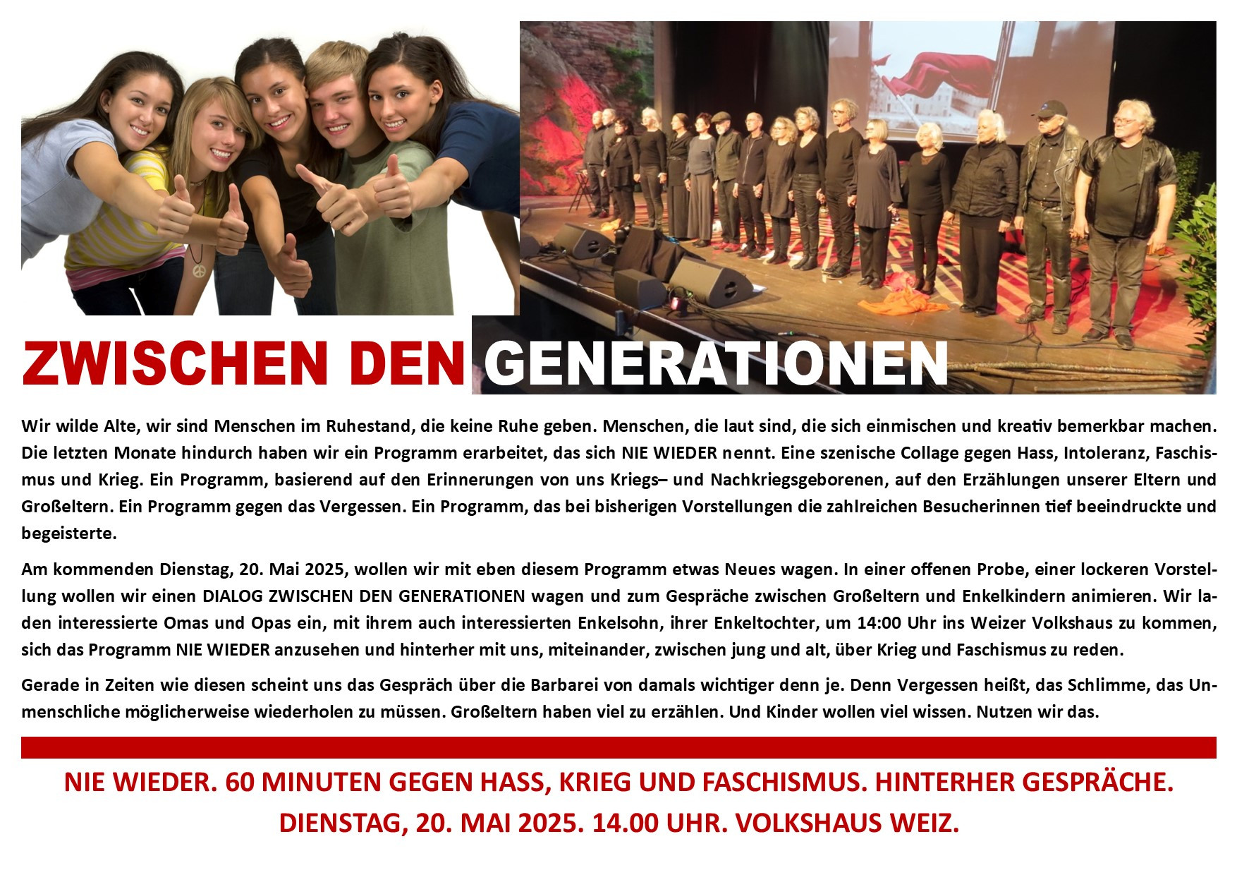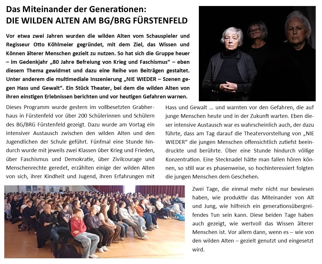 Das Miteinander der Generationen, das gemeinsame Tun auch mit jungen Menschen war für die wilden Alten von Anbeginn an ein wichtiges Anliegen. Gerade rund um das Thema „NIE WIEDER“, um Krieg, Faschismus, Hass und Gewalt schien uns dieser Austausch von besonderer Bedeutung. So kam es nicht nur immer wieder zu Gesprächen mit den jungen Menschen im unmittelbaren Lebensumfeld der wilden Alten. Es wurden auch Kontakte zu verschiedenen Schulen aufgenommen, kam es zum Austausch, zu Diskussionen mit einzelnen Schulklassen, gab es spezielle Vorstellungen von „NIE WIEDER“ speziell für Schulklassen, wurden Radiosendungen zum Thema mit Jugendlichen gestaltet ...