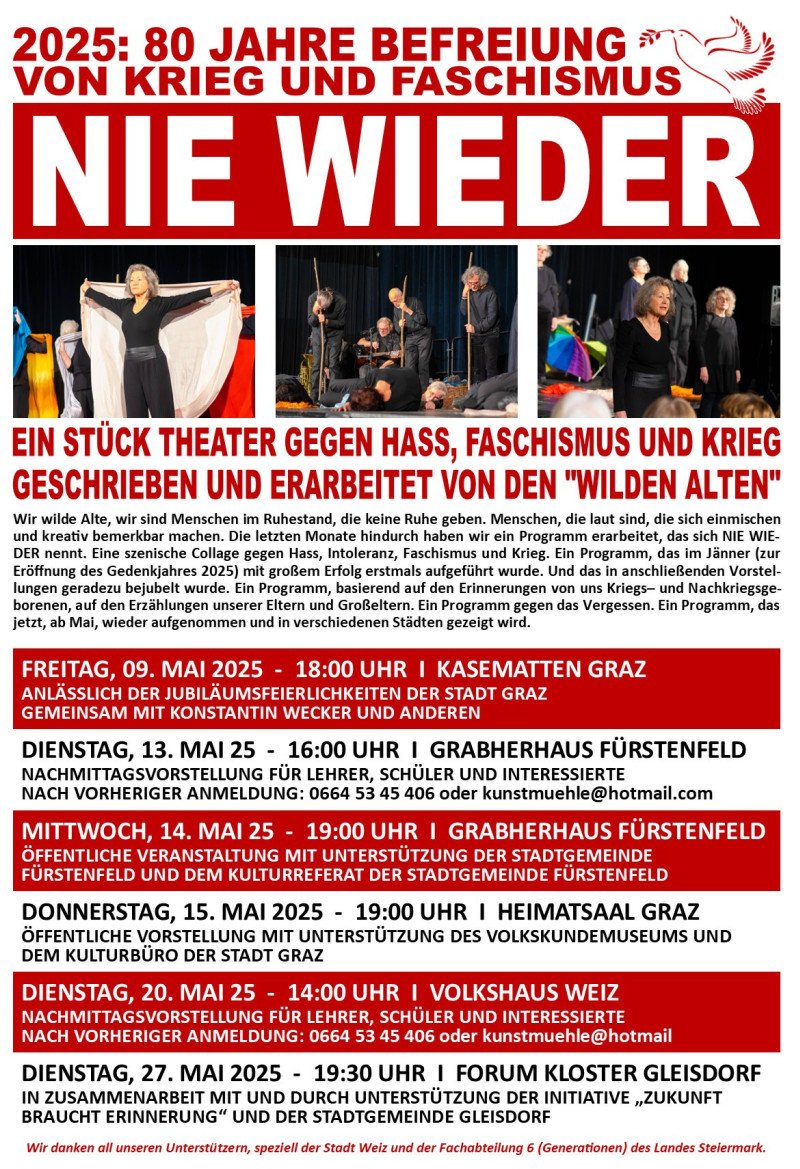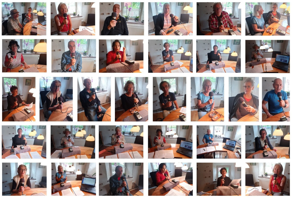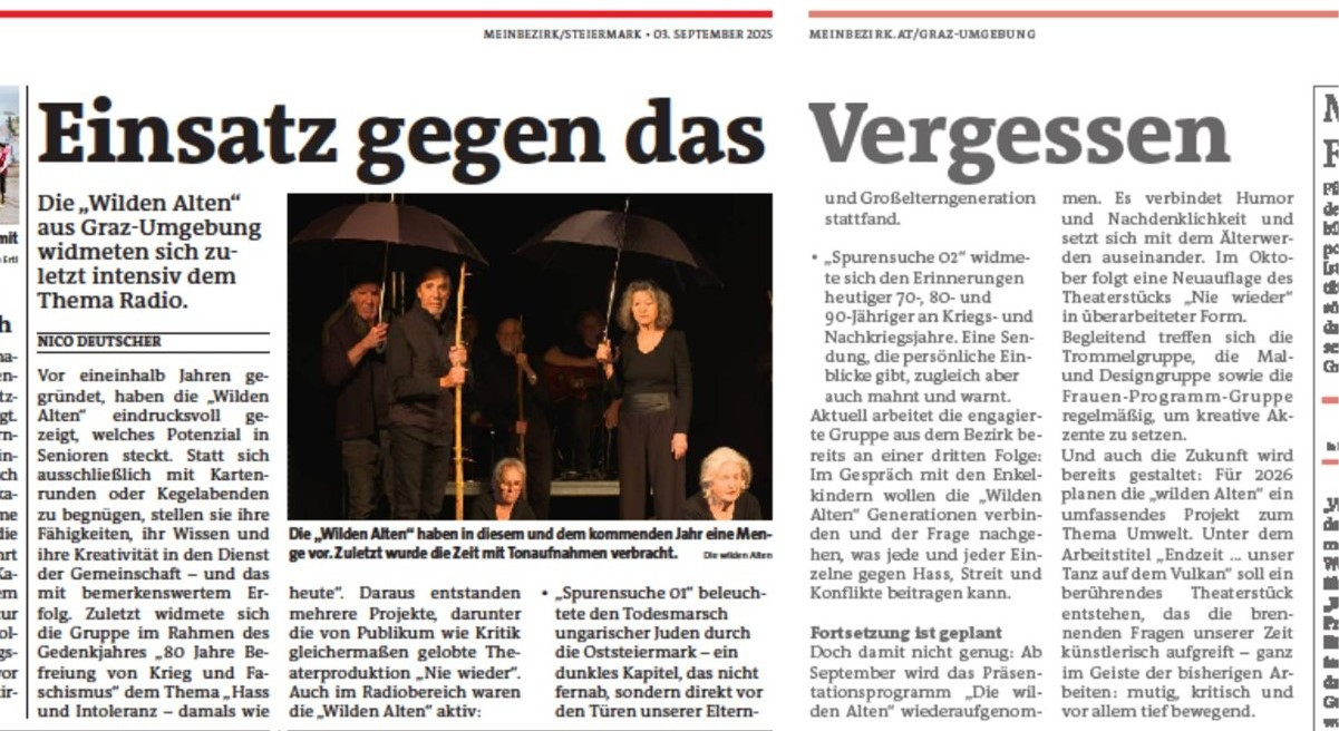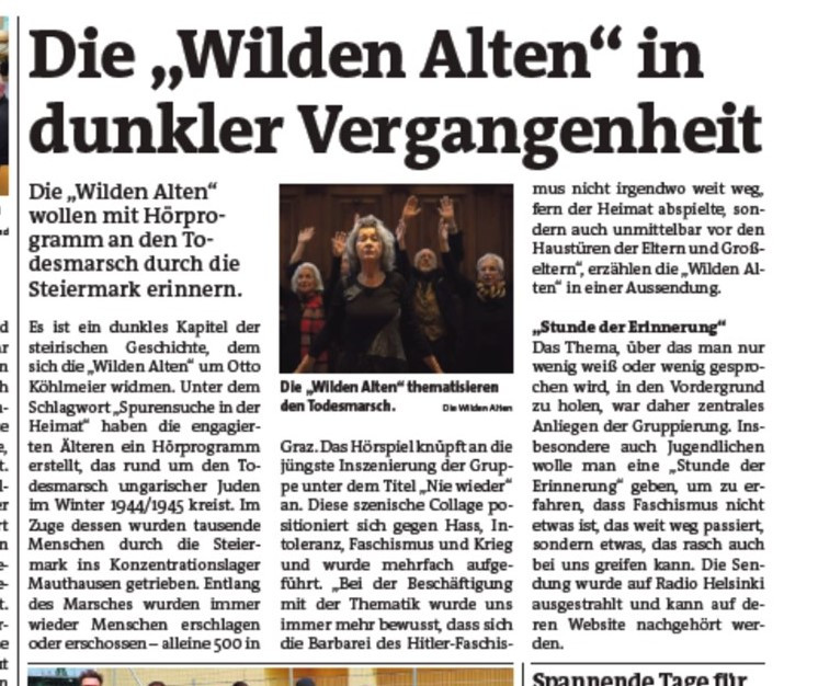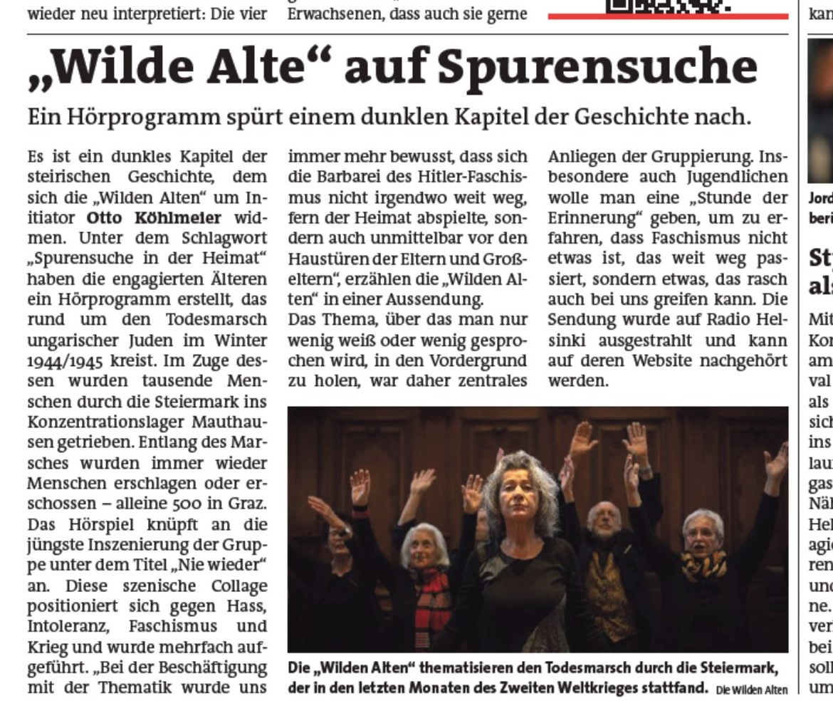 Neben der Gesamtgruppe der wilden Alten gibt es auch Detailgruppen, die in ihrem Bereich Beiträge zum jeweiligen Schwerpunktthema erarbeiten. Da gibt es eine Trommel- und Rhythmusgruppe, die für unüberhörbare Akzente sorgt. Da gibt es das Malkollektiv der wilden Alten, das mit Bildern und Ausstellungen das Thema aufbereitet. Da gibt es die Radiomacherinnen, die monatlich eine einstündige Radiosendung zum jeweiligen Thema gestalten, die jeden ersten Mittwoch im Monat von Radio Helsinki, dem Grazer Stadtradio, ausgestrahlt wird und in der Folge weltweit nachgehört werden kann. Programme, in denen die wilden Alten von ihren Erlebnissen berichten, vom Todesmarsch der Juden durch ihre Heimatgemeiden erzählen, mit ihren Enkeln über Krieg und Faschismus reden ...